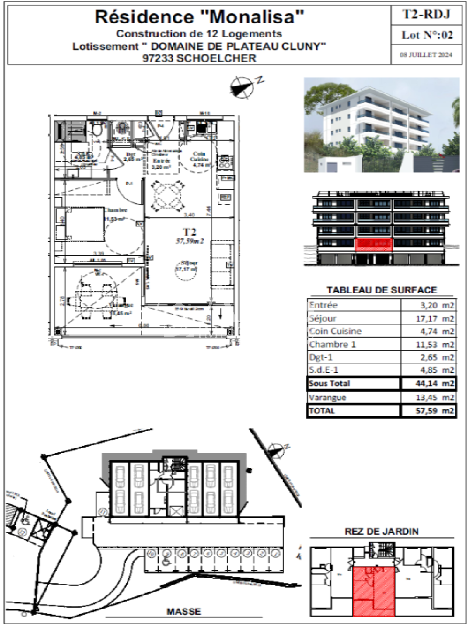 ACS IMMOBILIERS vous propose dans ce beau programme neuf de 12 logements, situé dans le quartier résidentiel de Cluny, sur la commune de SCHOELCHER, ce T2 en rez-de-jardin comprenant : une entrée, un séjour de 17.17 m², un coin cuisine, une chambre de 11.53 m², un dégagement, une salle d'eau, une varangue de 13.45 m² et une place de stationnement privative extérieure.
