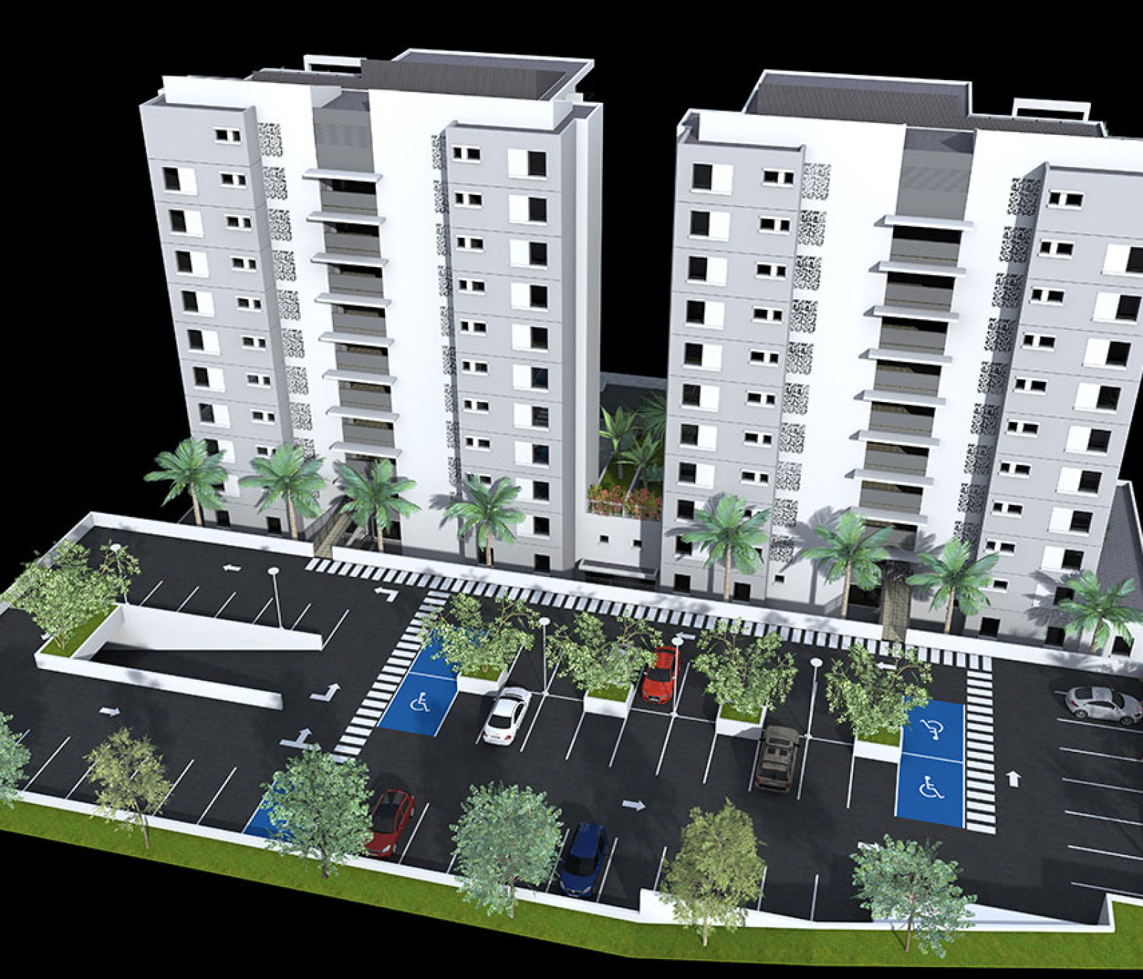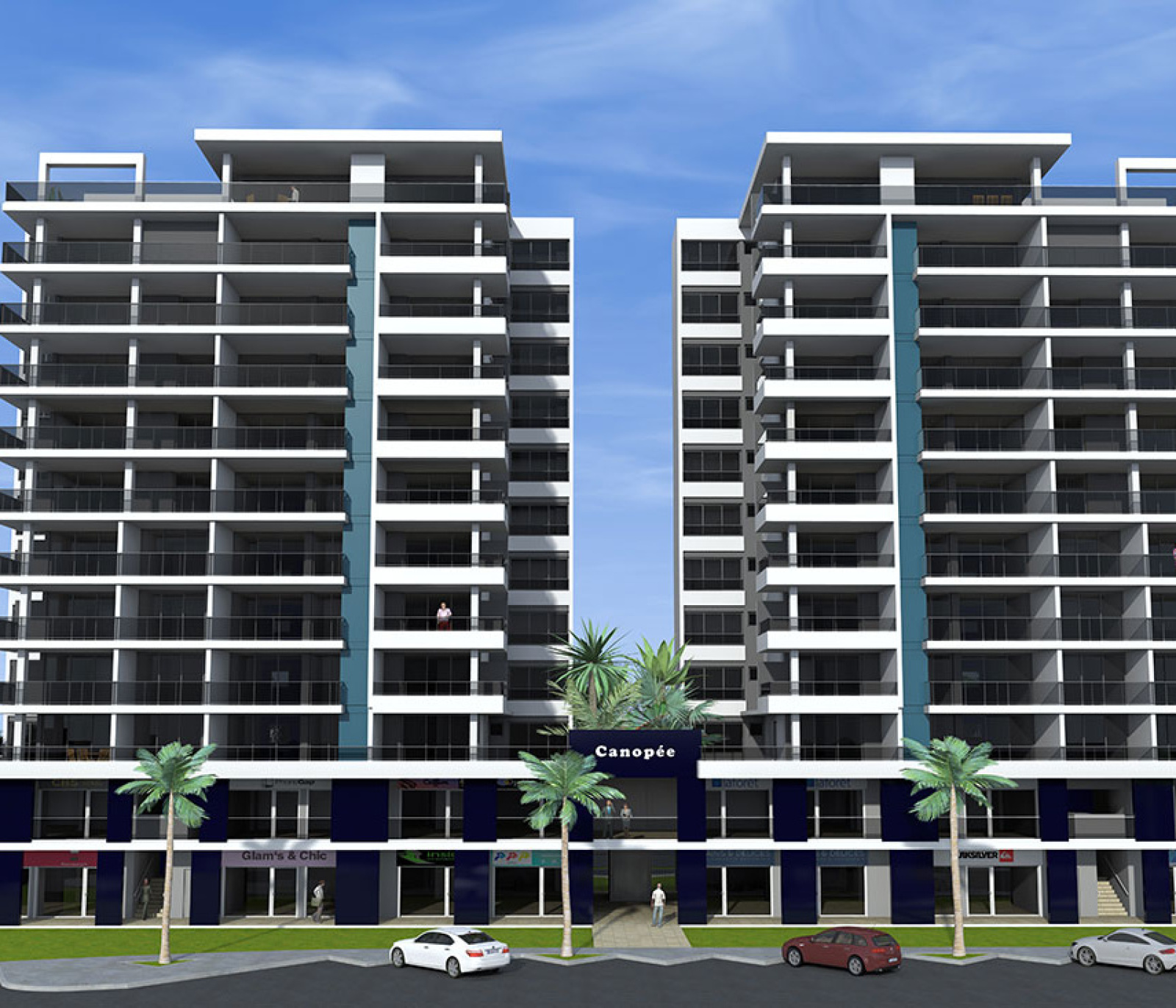 L'ensemble est composé de deux bâtiments indépendants, Tours jumelles de 34 mètres, soit 11 étages, avec vue mer imprenable pour tous les appartements, reliés entre eux par quatre passerelles piétonnes et séparés par un espace vert. Ils comprennent également une galerie commerciale au RDC donnant sur la MARINA, bureaux (type E.R.P.) et appartements.