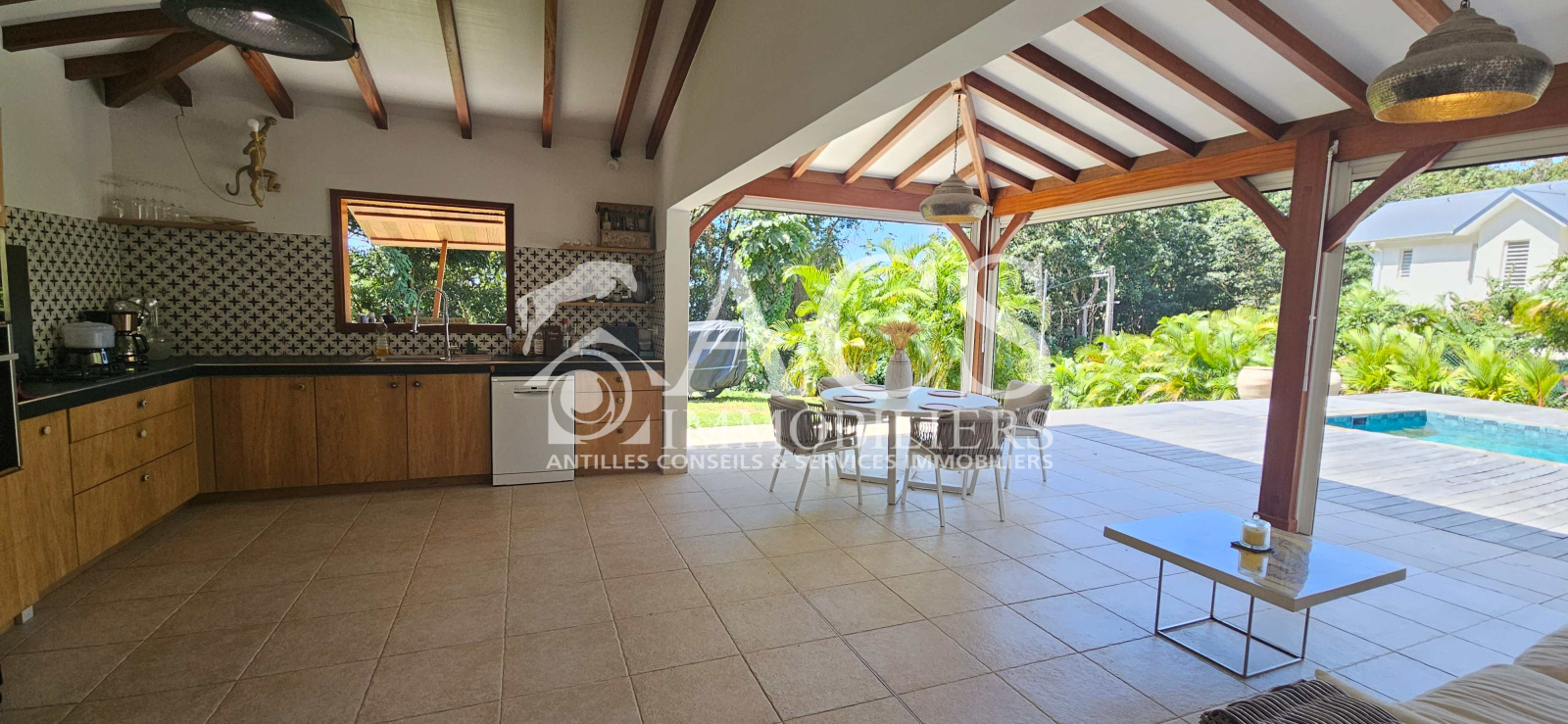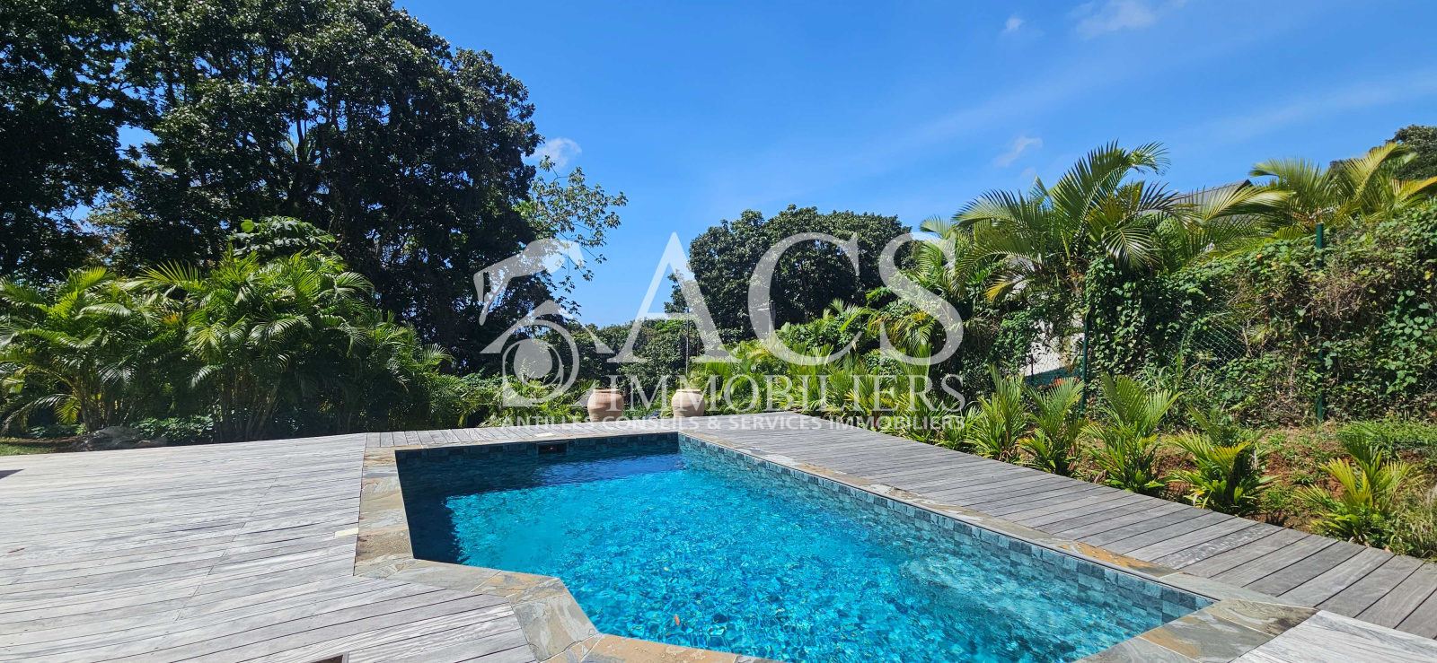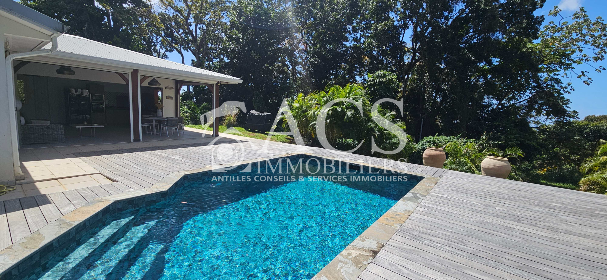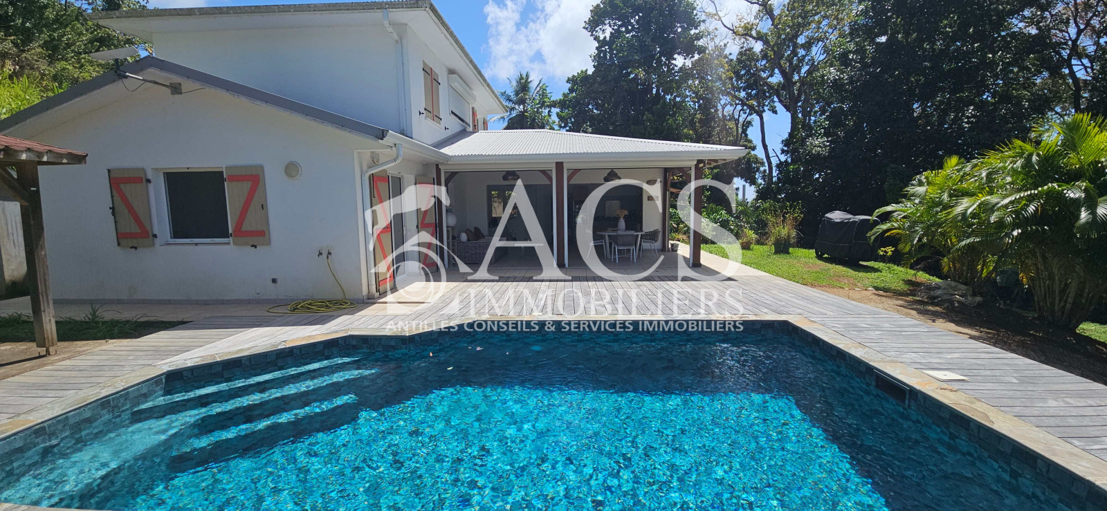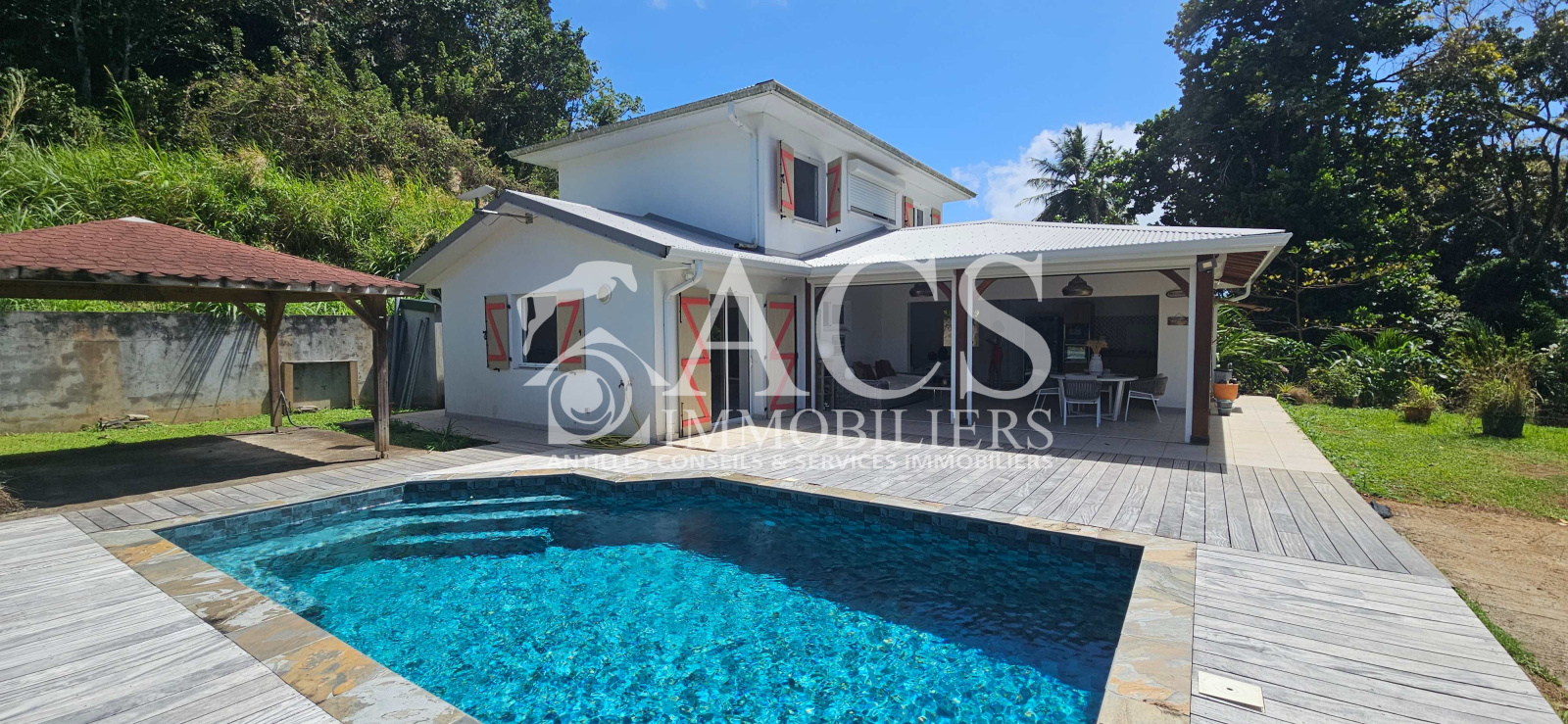 L'ensemble est completé par une piscine au sel 8x4 et son deck de 60 m², un carbet de 25 m² et un abri de jardin de 5m², un local technique, un système de récupération d'eau de 5000L avec filtre et pompe relié aux WC et lave linge et un chauffe-eau solaire.